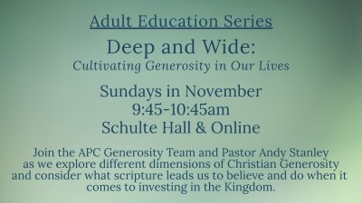 Join the APC Generosity Team and Pastor Andy Stanley as we explore different dimensions of Christian Generosity and consider what scripture leads us to believe and do when it comes to investing in the Kingdom.