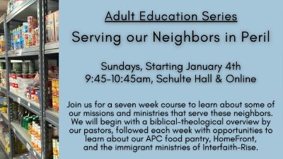 When a man asks Jesus about the way to attain eternal life, Jesus turns the question back to him. The man answers, quoting the scriptures, to love God and love your neighbor. “You have given the right answer,” says Jesus, “Do this, and you will live" (Luke 10:28). We at APC seek to follow Jesus' command to "do this" by ministering in creative ways to neighbors struggling with life’s most basic needs: food, housing, and health. Join us for a seven week adult education course to learn about some of our missions and ministries that serve these neighbors. We will meet Sundays 9:45-10:45 am in Schulte Hall, beginning January 4 with a biblical-theological overview by our pastors, followed each week with opportunities to learn about our APC food pantry, HomeFront, and the immigrant ministries of Interfaith-Rise.