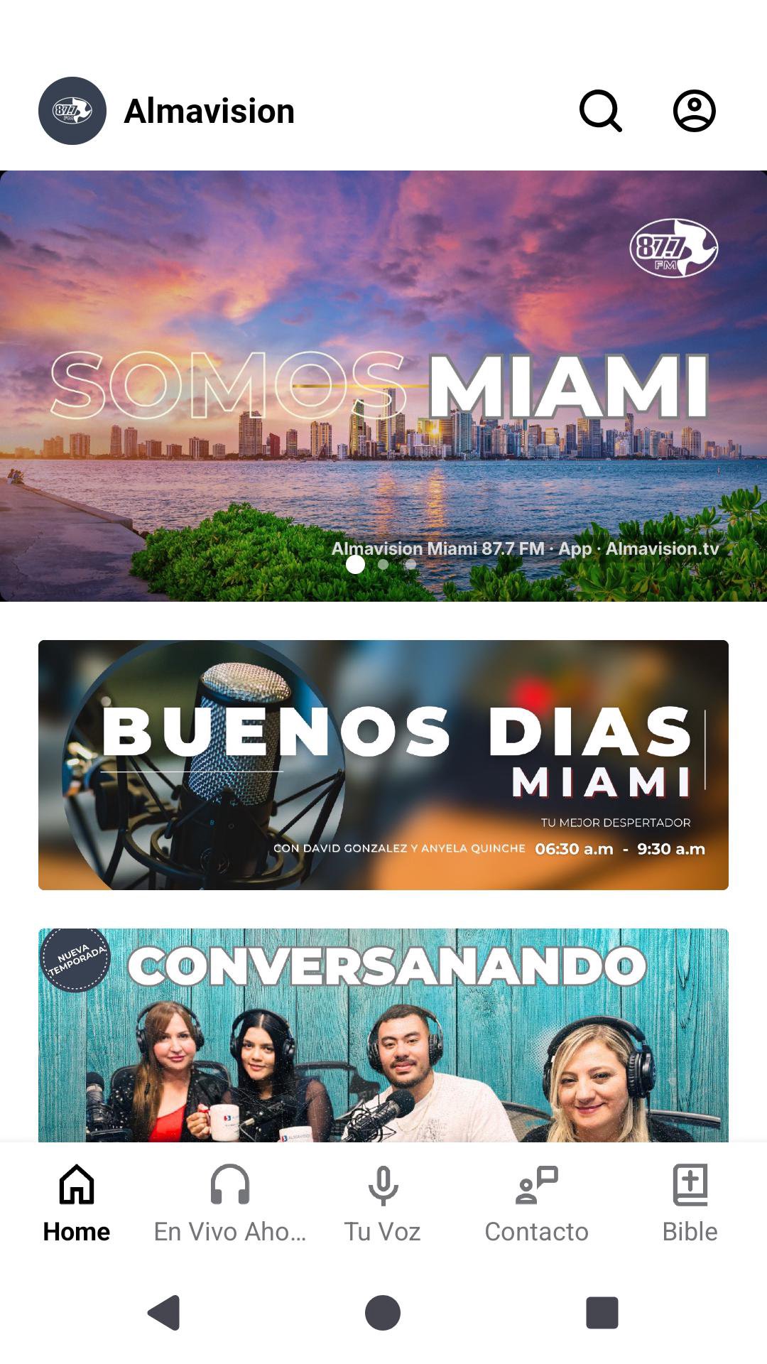 Almavisión Miami 87.7 FM es la estación cristiana que llega a los 3 condados mas importantes del Sur de la Florida: Miami Dade, Broward y Palm Beach. Desde el año 2009 Almavision Miami a estado al servicio de la comunidad latina, conectando a familias con un mensaje de fe, esperanza y propósito. Nuestra programación está diseñada para la comunidad latina, ofreciendo música cristiana, mensajes de inspiración, espacios de oración y contenido que acompaña la vida diaria desde una perspectiva de fe y valores Cristianos. Con la app oficial de Almavisión puedes escuchar la señal en vivo, mantenerte conectado con tus programas favoritos y llevar contigo una voz que entiende tu cultura, tu idioma y tu caminar espiritual. - ¿Qué encontrarás en la app? - Escucha Almavisión Miami 87.7 FM en vivo, 24/7 - Tu Música cristiana favorita - Espacios de oración y reflexión diaria - Una experiencia clara, sencilla que bendecirá tu vida. Almavisión es más que una estación: es una voz de fe que acompaña en cada paso de la vida.