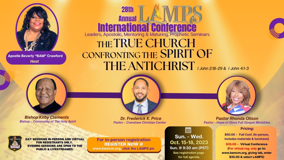 Join our conference host Apostle Beverly "BAM" Crawford for the 28th Annual L.A.M.P.S. Conference 2023. L.A.M.P.S. is an apostolic network and fellowship of ministries, which facilitates and nurtures meaningful relationships among pastors, ministers, leaders, and other powerful ministry gifts, enabling them to be more effective in their calling for the purpose of multiplying strong churches, business and marketplace ministries around the world. Agenda: (Click more to the right to view.) Sunday October 15, 2023 Morning Session ~ 9:30 a.m. (Open to the public) Evening Session ~ 6:00 p.m. (Open to the public) ~ Dr. Frederick K. Price Monday, October 16, 2023* Coffee Reception ~ 9:00 a.m. (Registrants only) Morning Session ~ 10:00 a.m. (Registrants only) Evening Session ~ 7:30 p.m. (Open to the public) ~ Bishop Kirby Clements Tuesday, October 17, 2023* Coffee Reception ~ 9:00 a.m. (Registrants only) Morning Session ~ 10:00 a.m. (Registrants only) Evening Session ~ 7:30 p.m. (Open to the public) ~ Pastor Rhonda Olison Wednesday, October 18, 2023* Leadership Luncheon ~ 12:00 p.m. (Registrants only) ~ Kingdom Community Youth Center (KCYC) 319 East Kelso Street, Inglewood, CA 90301 Located across the street from the Bible Enrichment Fellowship International Church *Agenda times may be subject to adjustment.