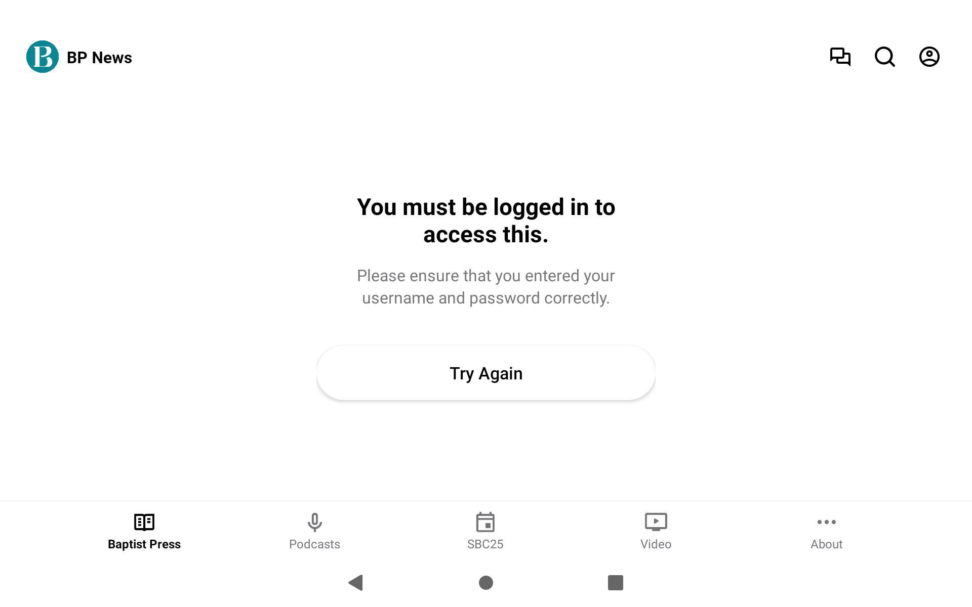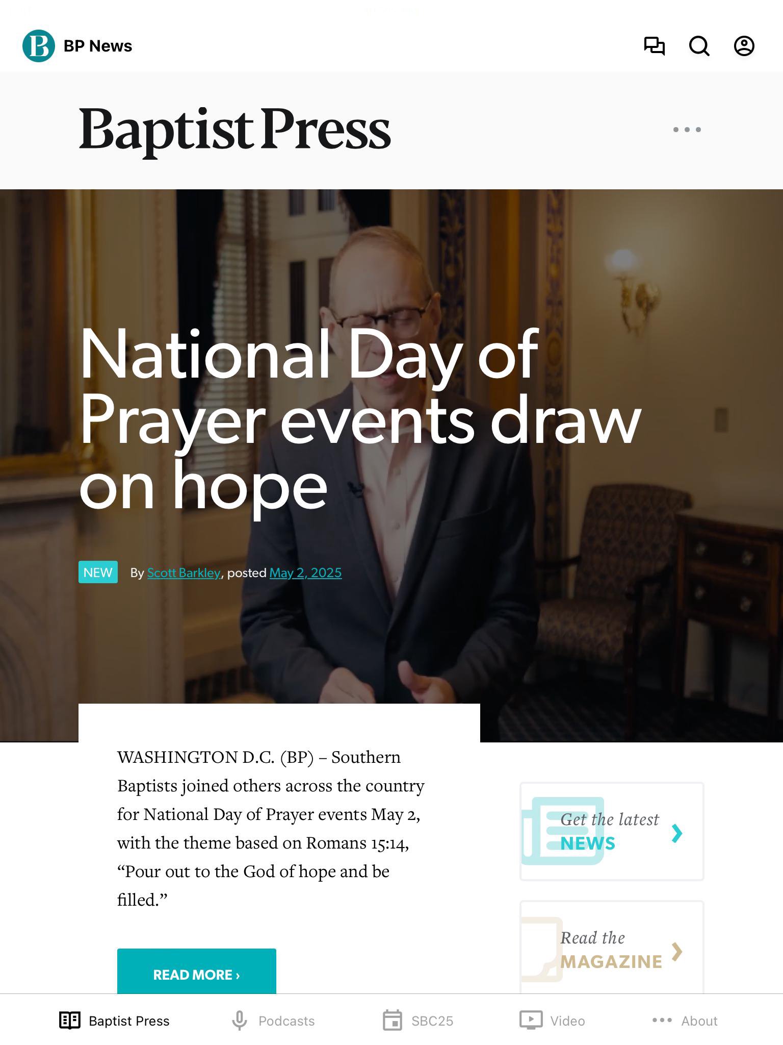 Welcome to the official Baptist Press app. Baptist Press is the news service of the Southern Baptist Convention. BP reports on missions, ministry and witness advanced through the Cooperative Program and on news related to Southern Baptists' concerns nationally and globally. The Baptist Press App also includes videos from past SBC Annual Meetings as well as the live stream of the 2024 SBC Annual Meeting in Indianapolis. For more information about Baptist Press, please visit baptistpress.com.