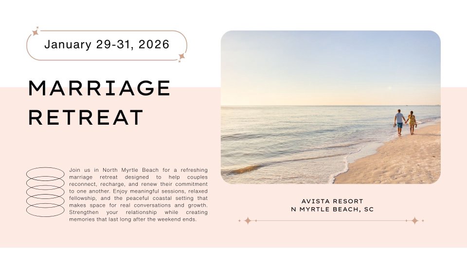 Join us in North Myrtle Beach for a refreshing marriage retreat designed to help couples reconnect, recharge, and renew their commitment to one another. Enjoy meaningful sessions, relaxed fellowship, and the peaceful coastal setting that makes space for real conversations and growth. Strengthen your relationship while creating memories that last long after the weekend ends.