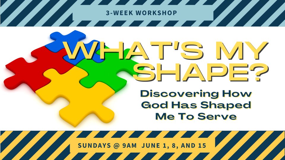 Join us for this free 3-week workshop as we explore how God has shaped each of us. We'll examine our SHAPE: our Spiritual gifts, our Heart, our Abilities, our Personality, and our Experiences. These all contribute to wisely discerning where we can best do good. We will meet at 9:00 am upstairs in the MPR. Please register so we can prepare materials and provide childcare if needed.