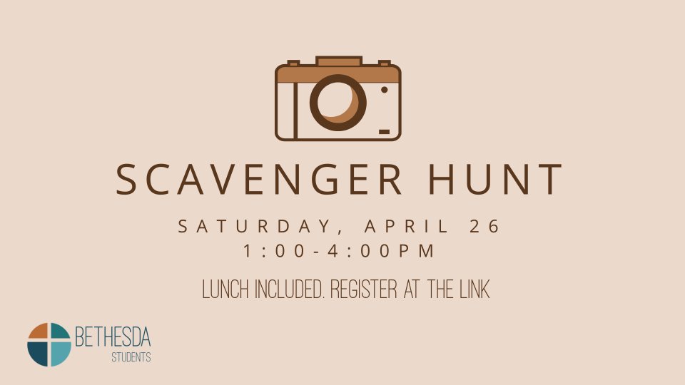 Students 6th-12th Grade- Get ready for an exciting and action-packed day with our Scavenger Hunt! We will have a picnic lunch on campus before we race against other teams to complete fun and quirky tasks around the local area! Each team will be given a list of tasks that can be completed around the neighborhood or town. These tasks will earn you points, ranging from simple challenges to more creative or daring missions. The mission is timed, so put on your running shoes and get ready!