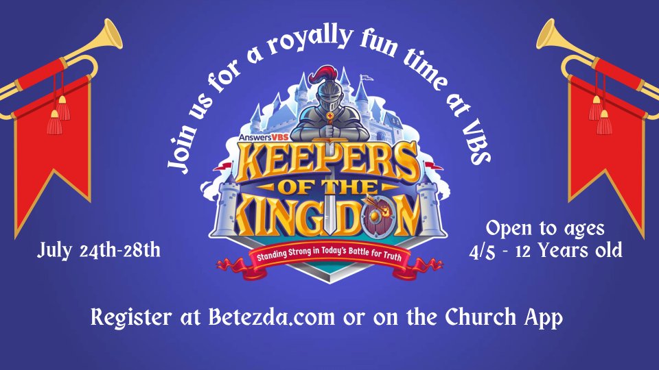 Bethesda Romanian Church Presents: Keepers of the Kingdom | Standing Strong in Todays Battle for Truth We are engaged in an epic battle for the hearts and minds of our Children. Every day, they’re bombarded with lies about who they are, who their Creator is, and where their salvation comes from. Thankfully, God has given his children armor to wear in this battle between truth and lies, light and darkness, good and evil. With this VBS, your kids will learn how they can be part of God’s kingdom through salvation in his Son and will be equipped with the armor of God to become Keepers of the Kingdom who stand strong in today’s battle for truth. VBS will be from 6-8 pm Monday - Thursday and 9-12 pm on Friday Open to Kids 4/5 - 12 Years old (Registration will open July 1st) We hope to see you there!