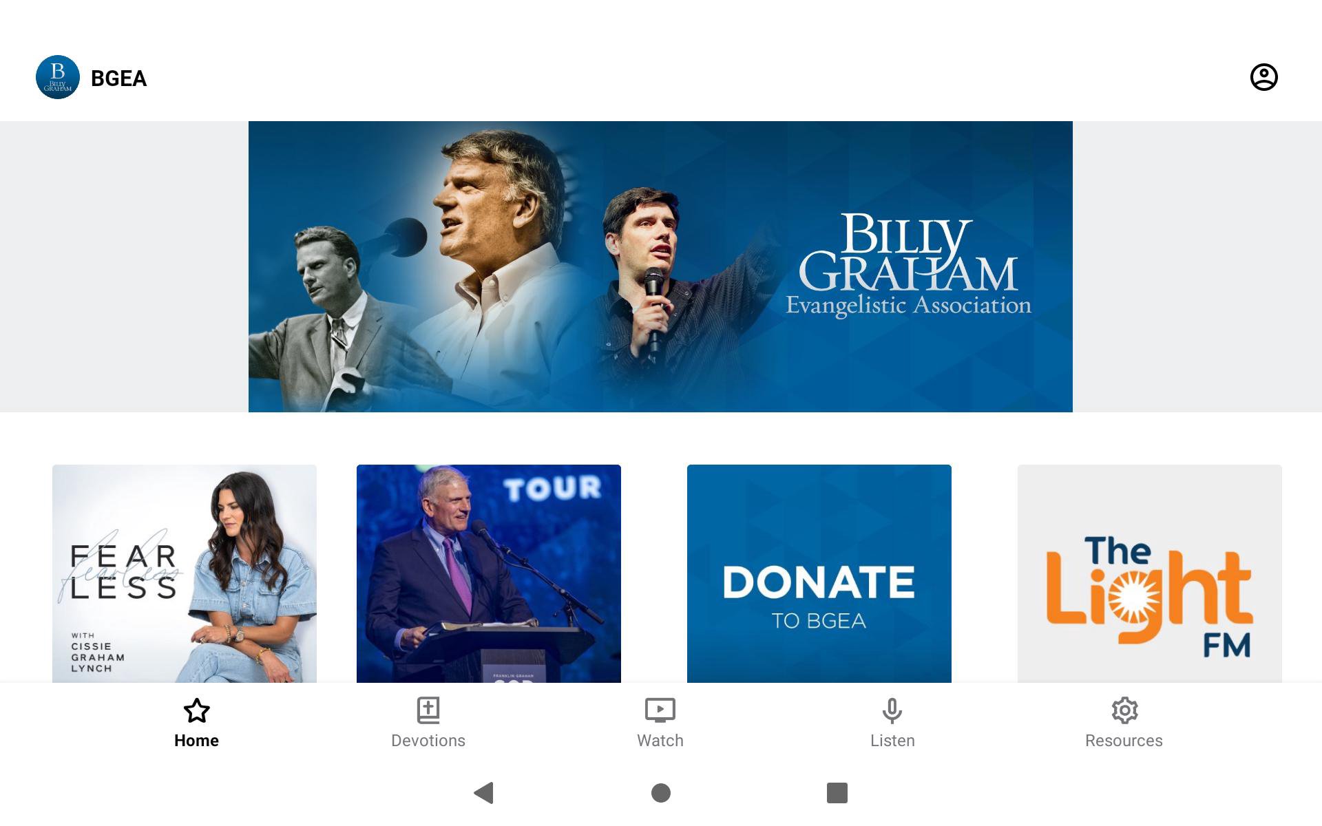 Welcome to the official Billy Graham Evangelistic Association application for mobile devices. Download this free app to get a new Billy Graham Devotion every day in an easy-to-read, mobile-friendly format. Watch and share some of our most-requested videos including our monthly TV specials and classic Billy Graham sermons. Listen to our latest radio programs including the weekly Hour of Decision featuring inspiring messages from Billy Graham and Franklin Graham - plus classic crusades and a live stream of 106.9 The Light. You’ll get the Bible in mobile-friendly reading and listen-aloud audio formats with a customized reading plan to bring God's word alive in your daily life. The app also has spiritual help and evangelism tools to help you share Christ with others. WiFi Internet is required for some devices. For more information about Billy Graham Evangelistic Association, please visit: http://www.billygraham.org/ The Billy Graham App was created with The Church App by Subsplash.