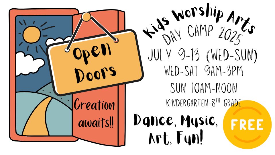 July 13 10am-12:30pm (This is our Worship Service where we will lead our congregation in everything we've learned! We ask that all participants commit to participating in this last day of camp!)