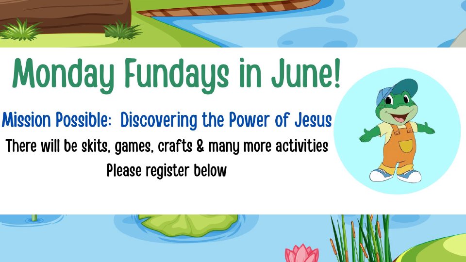 If you are a Rising Kindergartner through a Rising 6th grader, please join us on Mondays June 9th, 16th, 23rd & 30th from 8:00AM to 5:00PM for Monday Funday Summer Kidz Kamp. There will be games, crafts, skits & many other activities as we investigate Mission Possible: Discovering the Power of Jesus. We will join Reggie the Frog & his friends as they help Reggie overcome his fears. Our theme verse for the month is Isaiah 41:10 which begins "Do not fear, For I am with you;..." We hope you will join us! Lunch & snacks will be provided. If you have any questions, please feel free to email Paige at brcckidz@gmail.com.
