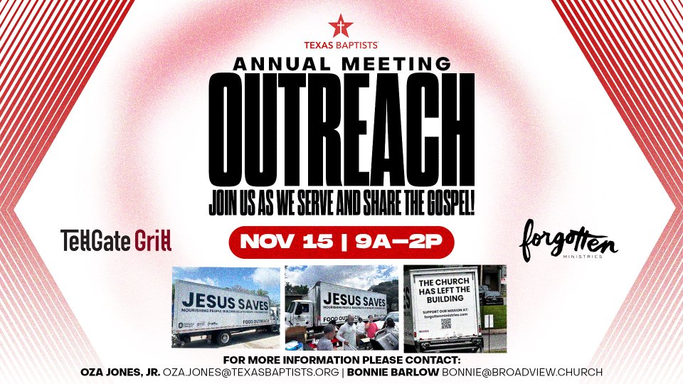 Join us as we partner with Forgotten Ministries for a Grill Walk Outreach, part of the Texas Baptist Annual Meeting Outreach! Broadview is proud to host this event, where we’ll visit three local apartment complexes to serve lunch, pray with residents, and share the love of Jesus. It’s a wonderful way to connect with neighbors, encourage them, and show God’s love in a real, practical way.
