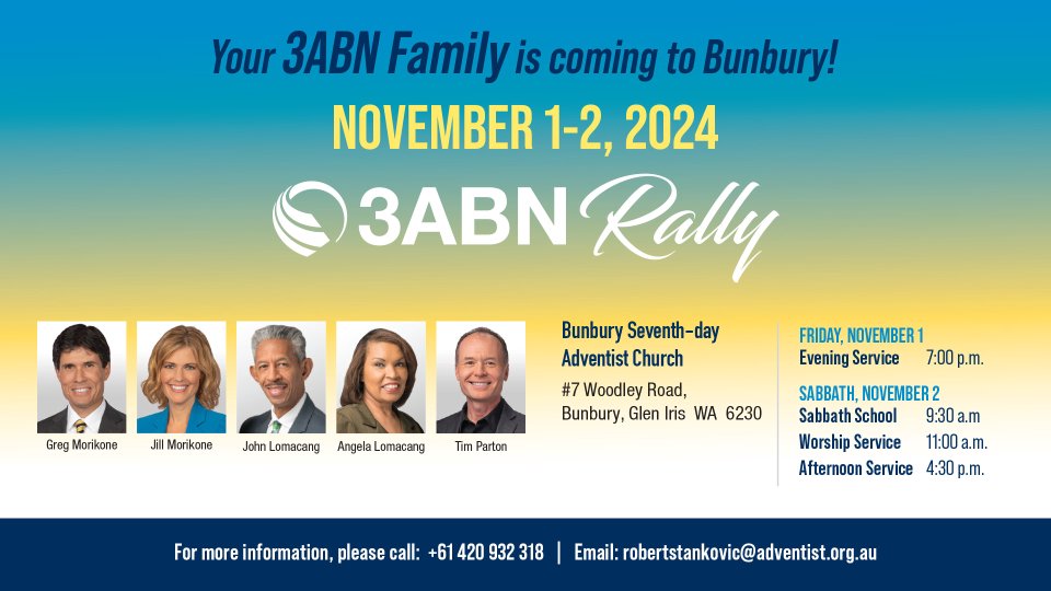 Mark your calendars for November 1st and 2nd, 2024, as we welcome the 3ABN Australia team to Bunbury Seventh-day Adventist Church! This is a unique opportunity to experience inspiring messages, uplifting music, and powerful testimonies that will strengthen your faith and draw you closer to Christ.