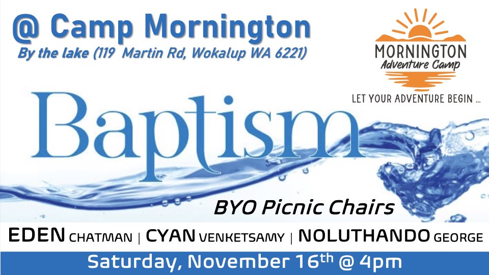 • BYO picnic chairs for baptismal service by the camp lake on Sabbath afternoon at 4pm (Baptismal candidates: Eden Chatman, Cyan Venketsamy, Noluthando George), plus for any outdoor leisurely sitting around the fire pit or around the camp.