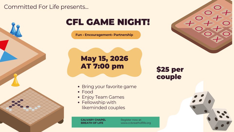 Join us for a fun and encouraging Marriage Ministry Game Night as we gather for an evening focused on teamwork, laughter, and fellowship with like-minded couples. This will be a wonderful opportunity to strengthen your marriage through interactive games, build connections with other couples, and enjoy a fun time together in Christian fellowship.