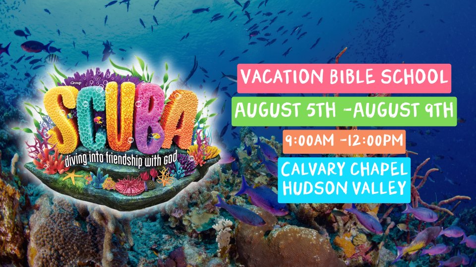 VBS 2024 SCUBA August 5, 2024 — August 9, 2024 09:00 am — 12:00 pm (EDT) at 36 Firemens Way Poughkeepsie, NY 12603. Take kids deep into an amazing undersea adventure where they’ll experience the ever-flowing, never-ending love of God. At Scuba VBS, kids will be immersed in the Word and discover what living water is really all about!