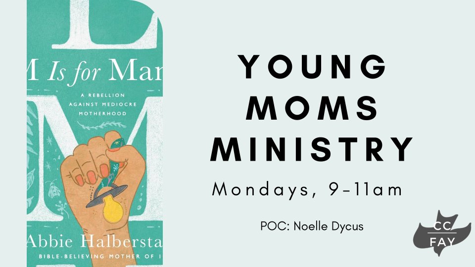 Women with young kiddos, this one's for you! If you are in need of time out of the house and time to study the word while your kiddos get some energy out playing, you will enjoy this ministry! Noelle Dycus will be leading the group through a book study: "M is for Mama" by Abbie Halberstadt. The group will meet here at the church weekly starting on Monday, October 9th (that's tomorrow) from 9-11am until Thanksgiving. They will take a break until the spring when it will start back up again. If you'd like to learn more, please contact the church office and we will put you in touch with Noelle.