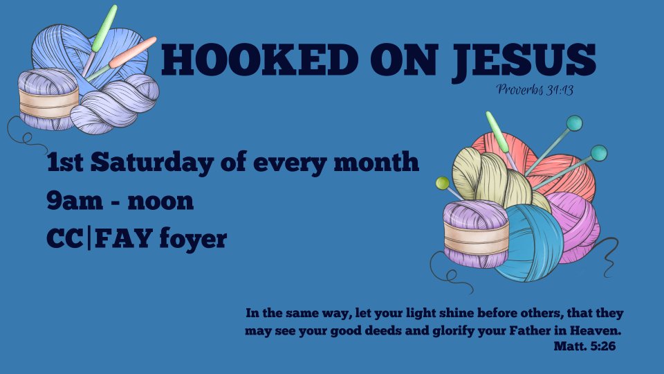 Our mission is to invest in the lives of others by teaching others to apply the word of God to their daily lives, develop their gifts and talents, and make strong lasting friendships, while individually becoming all that the Lord desires. Come learn how to crochet and knit. It's not your ability, but your availability. No prior experience is required. This class is for beginners, intermediate and advanced learners. Each month we will learn a new pattern. All items will be donated to the Ronald McDonald House. "Let the favor of the Lord our God be upon us and establish the work of our hands upon us; yes, establish the work of our hands!" Psalm 90:17. Please bring a 5mm crochet hook and your choice of red heart size 4 yarn.