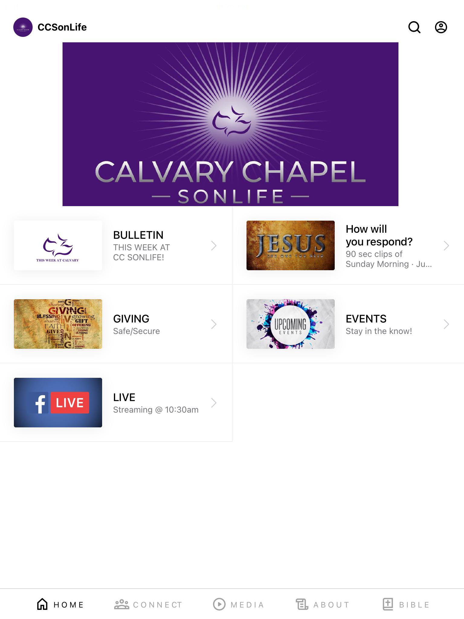 This app will help you stay connected with the day-to-day life of Calvary Chapel SonLife. With this app you can: watch or listen to past messages; stay up to date with push notifications; share your favorite messages via Facebook, Instagram or email; and download messages for offline listening. You can listen to the Bible in a Year, give online and search upcoming events or regular calendar events without ever logging in to a computer desktop. All of the relevant information at your fingertips.