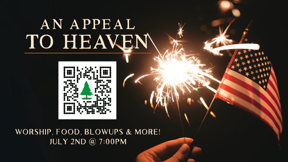 Join us Sunday, July 2nd, @ 7pm, as we meet together to make "An Appeal to Heaven" and celebrate our independence! As our government and culture continue to weaken under the banner of anti-God and anti-family values, we as a church are joining together to lift our prayers and stand as a united front against the enemy. We invite you to join with us as we fast throughout the day, preparing our hearts to pray collectively as a church family. We will begin in the sanctuary with some time of prayer and petition, appealing to God on behalf of our great Nation. We will then enjoy a family celebration, breaking our fast together. Across our property, we will have food from Common Table (Food for purchase), inflatables, and a outside concert. Farm 58 will have their Farmers Market set up as well. We will finish the evening with fireworks, as an outward expression of our prayers lifted up throughout the evening! NOTE: Due to an overwhelming response from families, we have made the entire evening a family-friendly event, thus, no childcare will provided for any age.