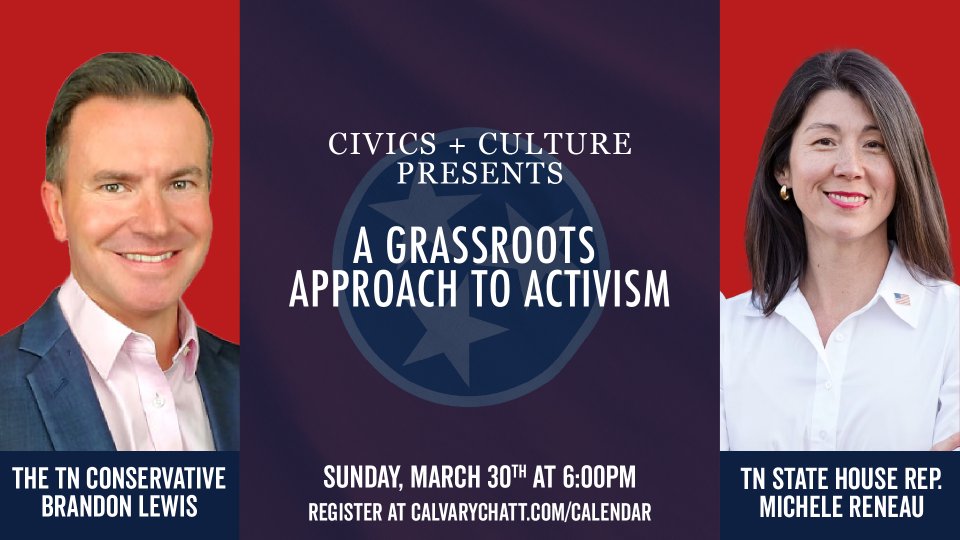 Please join us for our next Civics + Culture Event: "Revitalizing Chattanooga and Hamilton County Through Grassroots Activism” featuring special guests House Representative Michelle Reneau, CEO of Tennessee Conservative Brandon Lewis, and our very own Anne Lowery, Secretary of the Hamilton County Republican Party.
