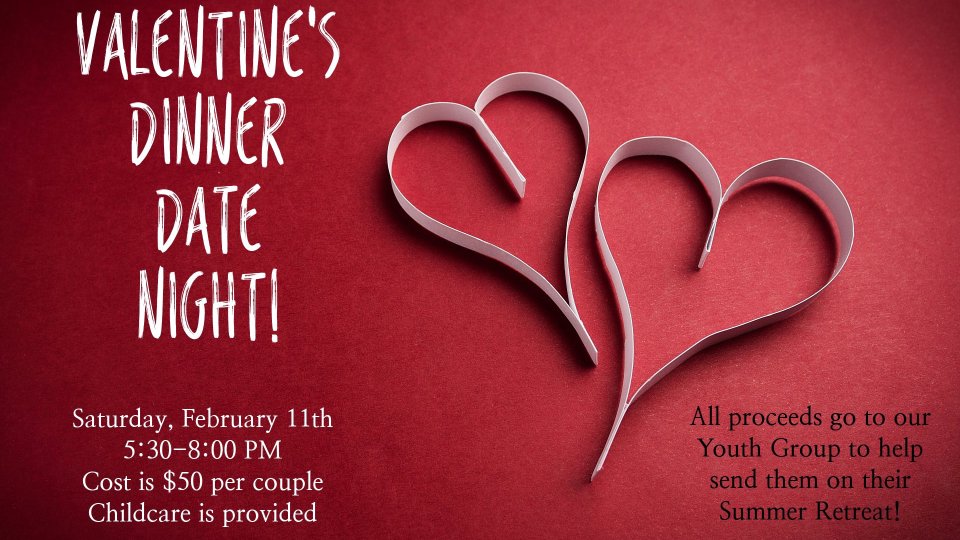 Our Marriage Ministry partners with our Youth Ministry to bring you a Valentine's Dinner Date Night! Visit our Info center beginning January 8th to reserve your table and join us for a wonderful evening of food, fellowship and fun complete with childcare! It's the perfect way to spend an evening with your Love. Cost: $50 per couple (choice of meal and dessert) Snacks and a movie will be provided with childcare for the kiddies! All proceeds will support our Youth Ministry.