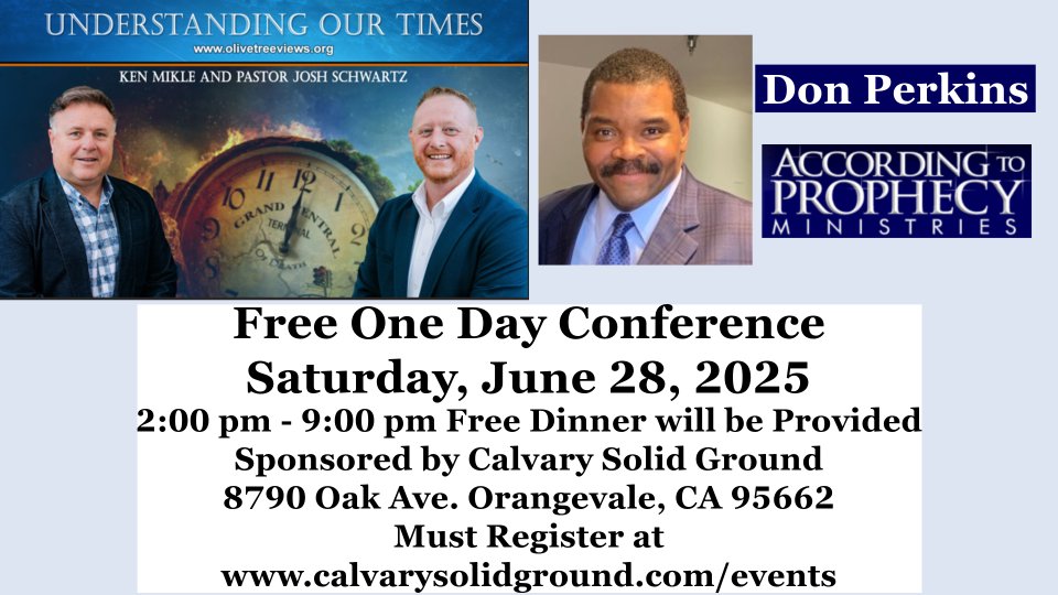 Join us for a free one day conference with Ken Mikle and Josh Schwartz from Understanding our Times and Don Perkins from According to Prophecy Ministries. If you can attend in person please click the register button below and let us know you are coming. A free dinner comes with this wonderful time of teaching and fellowship! Don's website is www.according2prophecy.org