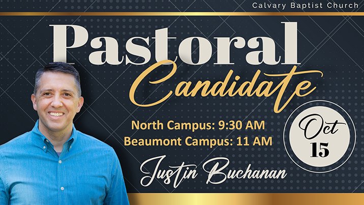 The Pastor Search Committee is excited to introduce Justin Buchanan as our Pastoral Candidate for Senior Pastor at Calvary Baptist Church. Sunday, October 15, Justin Buchanan, will preach at Calvary North at 9:30 AM and at Calvary Beaumont at 11:00 AM. All members of Calvary are invited to attend either of the worship services on Sunday to hear our candidate preach. Sunday evening at 6:00 PM, we will all gather in the worship center of Calvary Beaumont to hear him speak again. The church will then enter into a Special Called Business meeting for members to vote on the recommendation by the Pastor Search Committee to call Justin Buchanan as Calvary's Senior Pastor. There are still a few spots available for "Meet the Pastoral Candidate" this Saturday, October 14 at 8AM and 12 PM. Contact the church office at 409-898-7074 for more information. Justin has served in Christian ministry for more than twenty years. He has been honored to serve churches in Tennessee, North Carolina, and Texas in various positions. Among those positions he has been a children's minister, student pastor, church planter and lead pastor. He also served on the faculty of Southwestern Baptist Theological Seminary for three years. Additionally, Justin enjoys writing and is the author of two books, Parenting in the Mission of God and Guys and Lies, and has contributed chapters to a few additional works. He earned a Bachelor of Science degree in psychology, a Master of Divinity in Christian Ministry, and a Doctor of Philosophy degree in applied theology. He and his beautiful bride, Sarah, have been married for twenty years and are the parents of five fantastic sons.