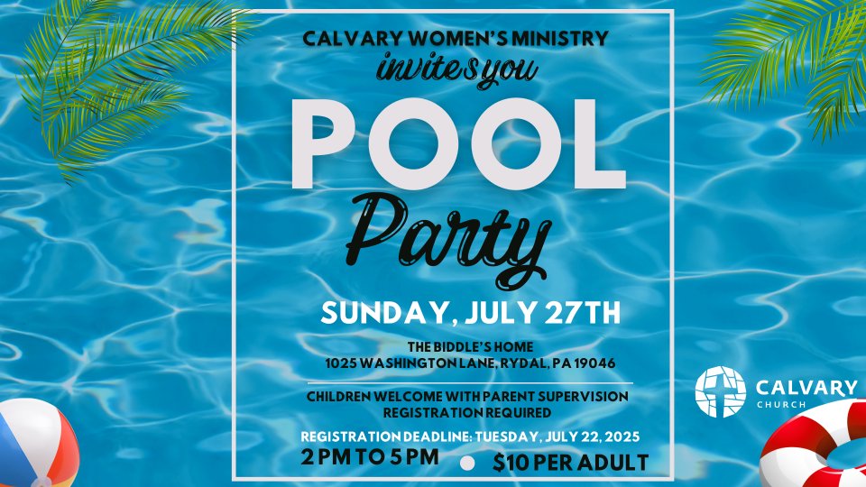 Join the Calvary Women's Ministry for our annual Pool Party. There will be great food, competitive pool, yard games with prizes awarded, and a fun time of fellowship. We encourage you to join us. Children are welcome at no charge with close adult supervision. Sign up before the deadline!