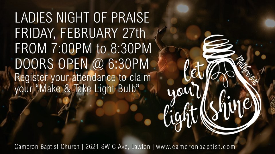 Ladies, you’re invited to a Night of Praise on Friday, February 27th at Cameron Baptist Church. Join us for a meaningful evening of worship through song, led by The Band of Cameron Baptist Church, as well as worship through art and sign language. Worship begins at 7:00 PM, with doors opening at 6:30 PM.