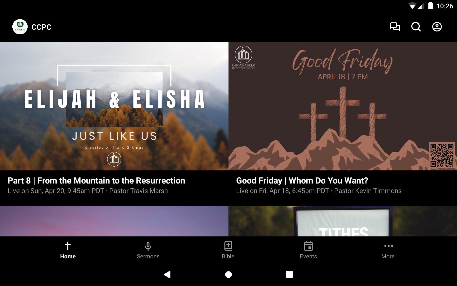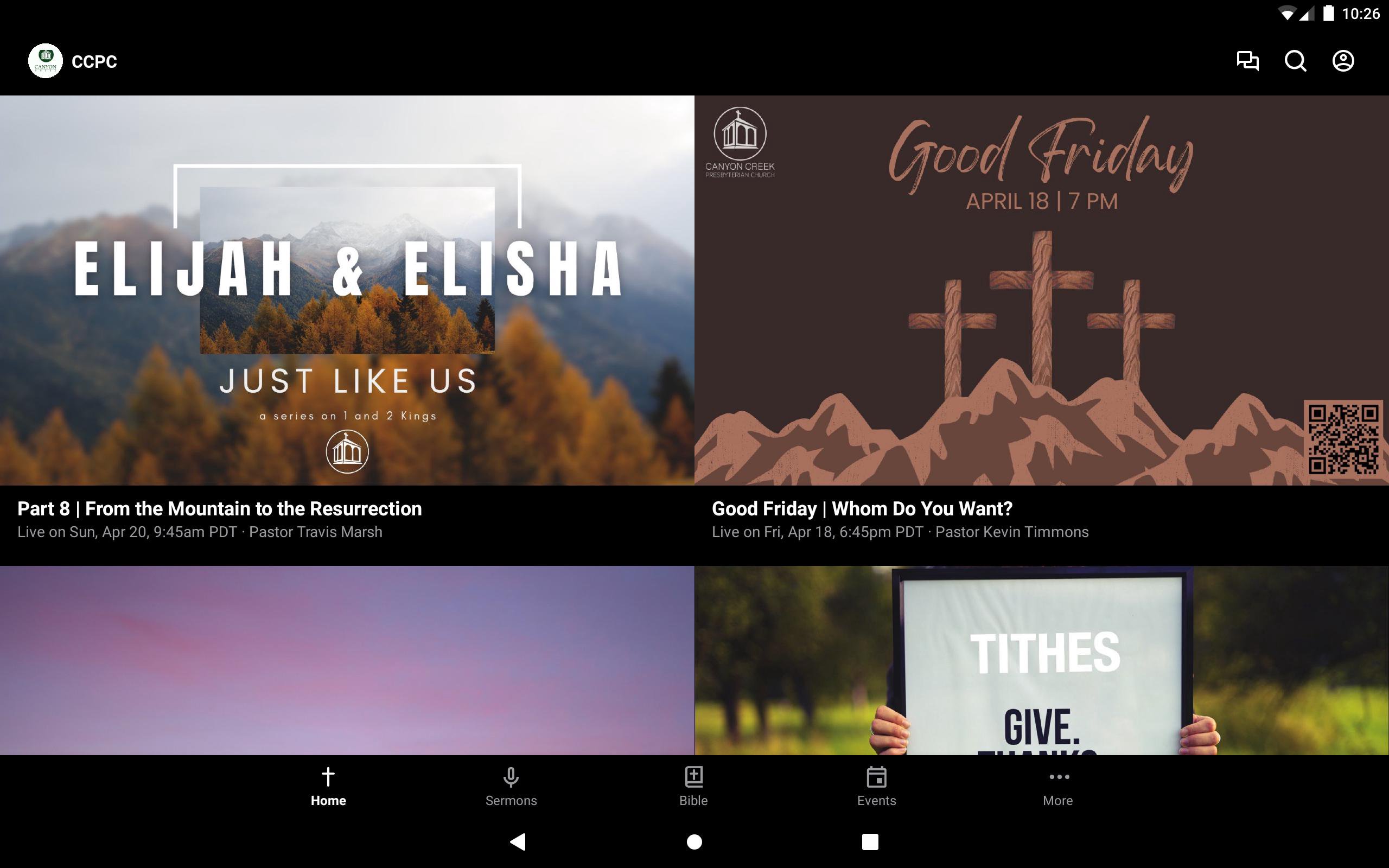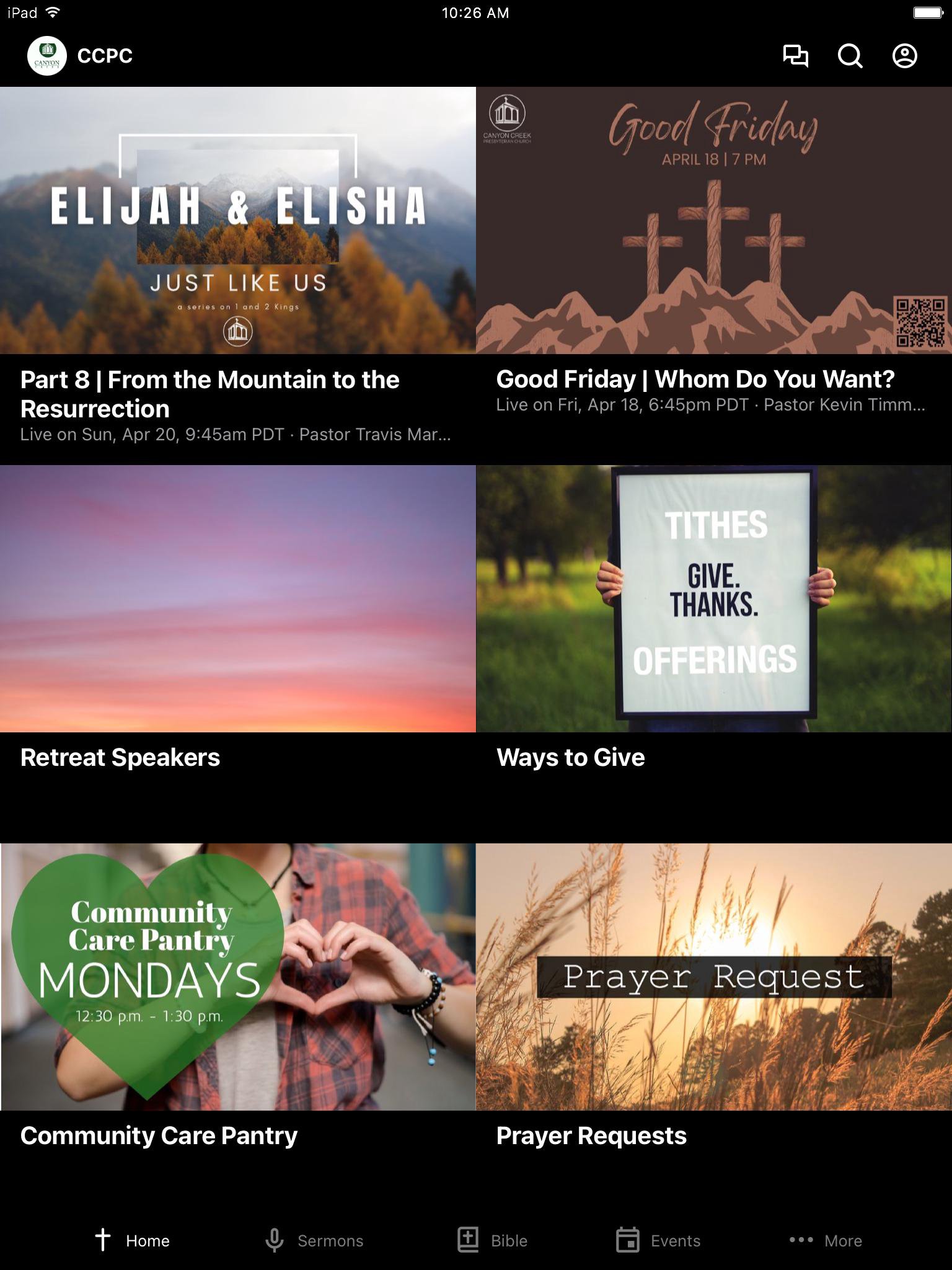 Welcome to the app for Canyon Creek Presbyterian Church in San Ramon, CA. This app is meant to help connect you to the church community at Canyon Creek. Some ways you will be able to use this app: - Catch up on the latest sermons and messages - Find a Life Group for you and your family - Get Connected to one of our Youth Ministries - Access to Sunday service materials - Update your contact information - Online Giving - Register for events For more information please visit ccpc.church Our Mission: Empower People to Pursue Their Call In Christ