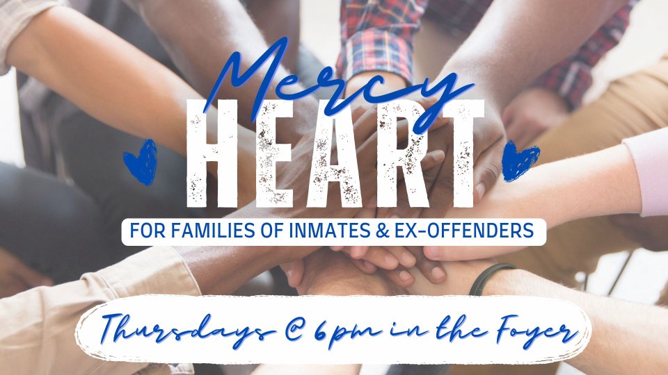 Mercy Heart is a group that has a heart to uplift & support families with incarcerated loved ones. They gather every Thursday at 6:00p in the Lobby for food, fellowship, worship & bible study.
