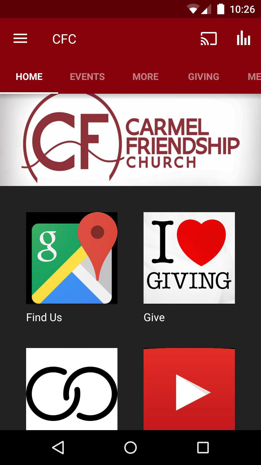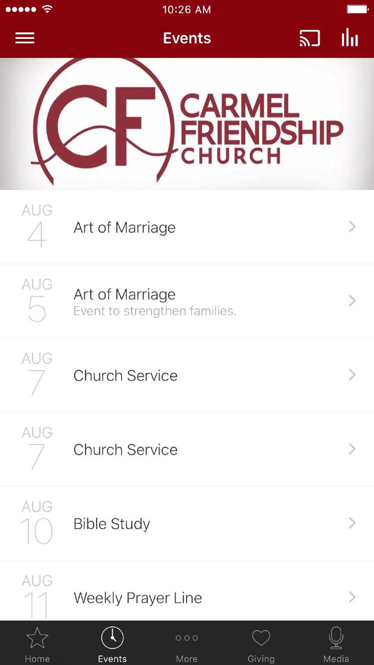 Welcome to the newly designed app of Carmel Friendship Church. You can check out sermons, social media, giving options, and feel free to share with your friends. The Carmel Friendship App was created with the Subsplash App Platform.