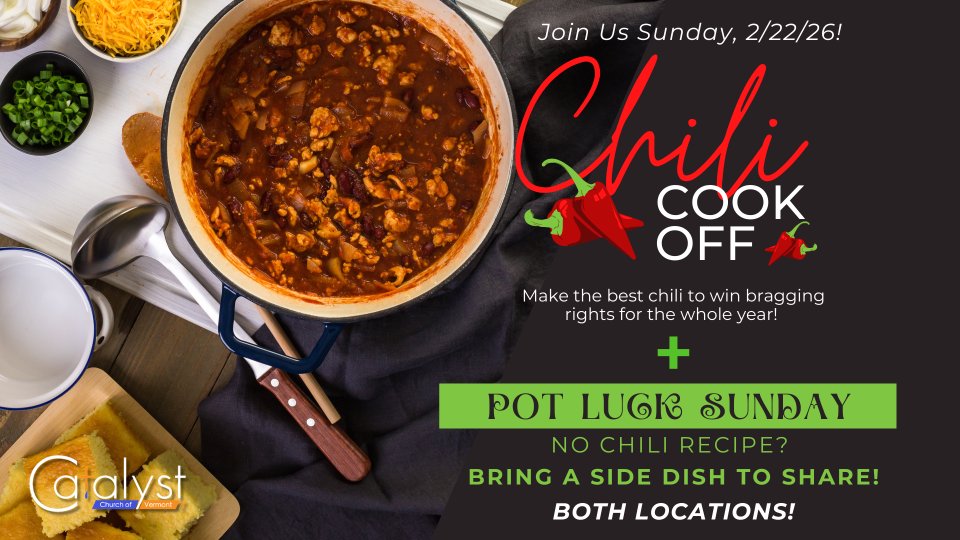 Join us for our Chili Cook-Off on Sunday, February 22, 2026, right after church at both our Jericho and St. Johnsbury locations! Whether you’re a seasoned chili champion or just love a good bowl of comfort food, this is a Sunday you won’t want to miss.