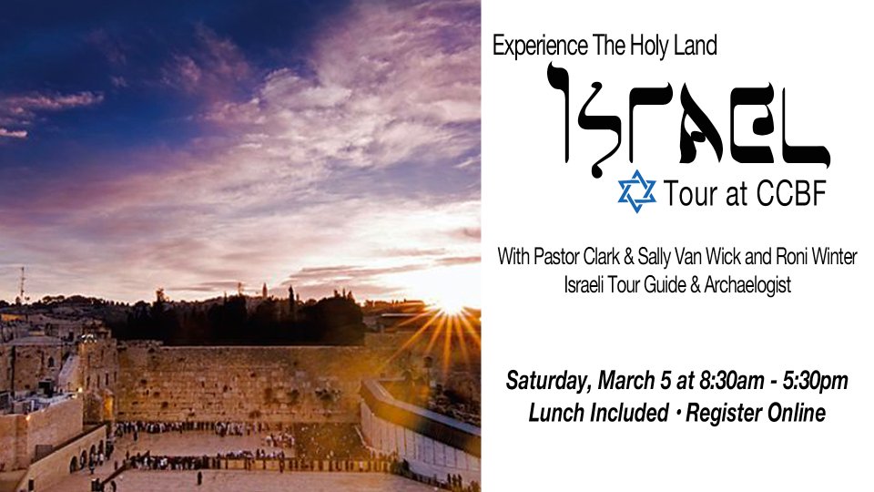 The 2022 Israel tour at CCBF with Pastor Clark and Sally Van Wick and Israeli archeologist, and tour guide Roni Winter will be Saturday, March 5 from 8:30 am to 5:30 pm. The price is $50 per person, ages 12 and older (by January 20) The price will increase January 21 to $60 per person. The registration includes a tour booklet, pen, coffee tumbler, continental breakfast, lunch by Panera Bread, snacks, Israel's famous Magnum bars, and the virtual tour itself. Space is limited and registration is required, as we are not able to accommodate walk-ins. The last date to receive a refund on your registration and order merchandise is February 25.