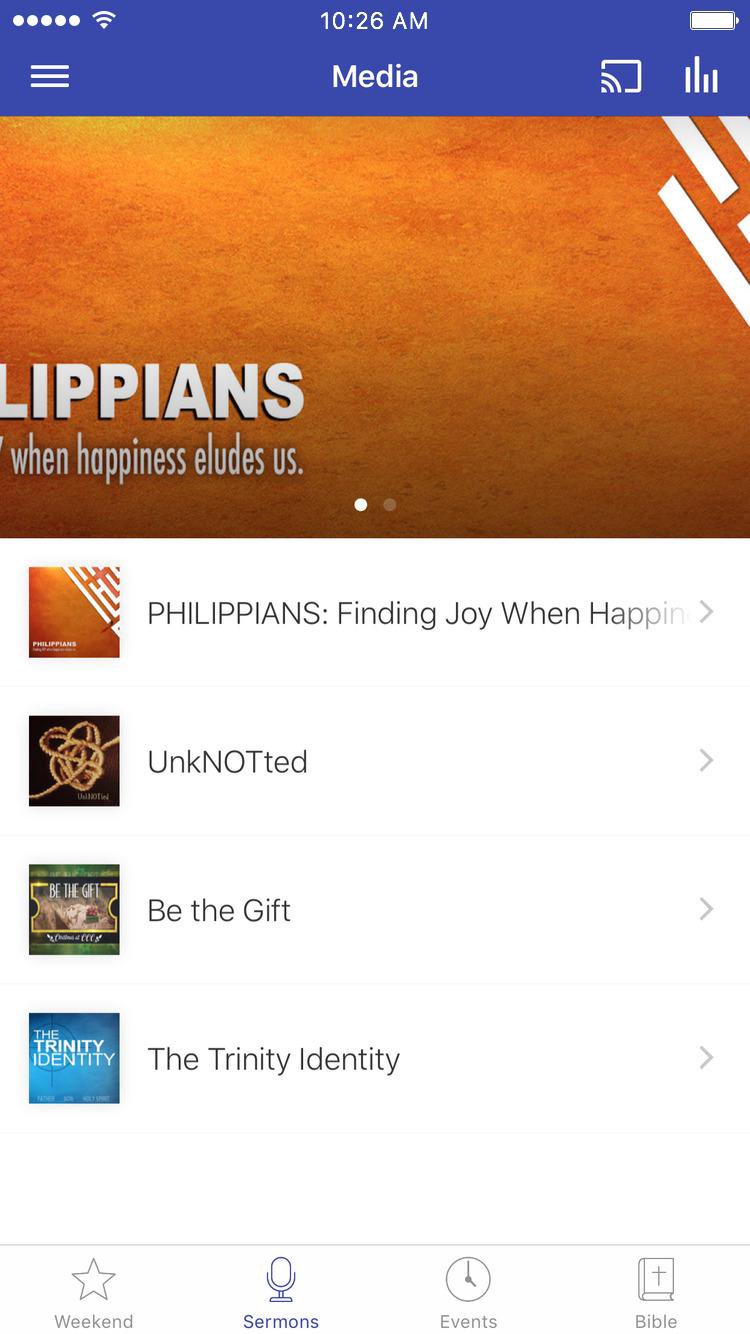 This app will help you stay connected with the day-to-day life of our church. With this app you can: watch or listen to past messages; stay up to date with push notifications; share your favorite messages via Twitter, Facebook, or email; and download messages for offline listening.
