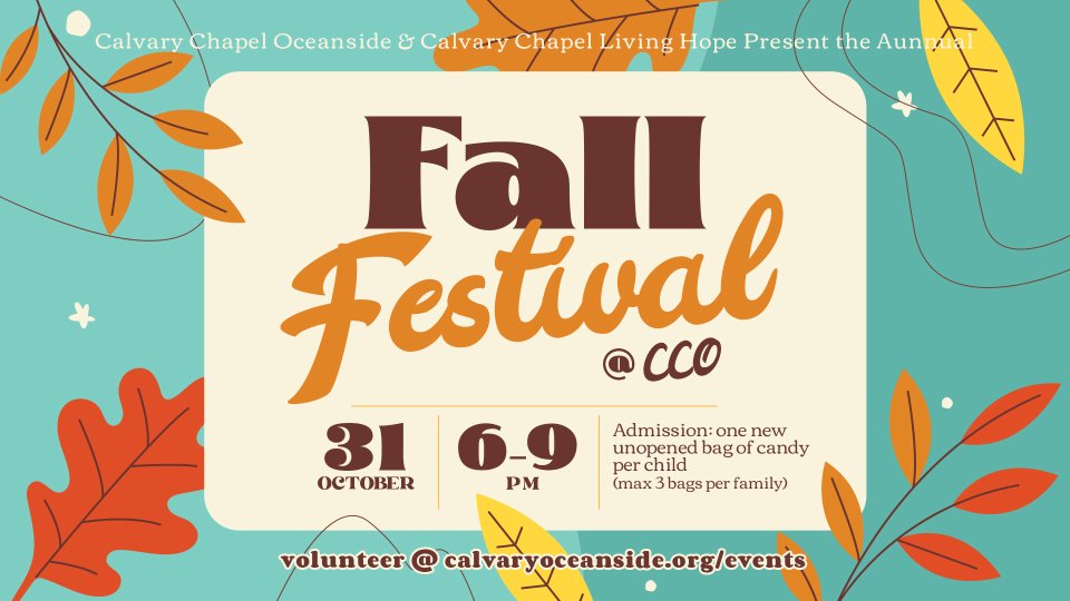 The Fall Festival returns October 31st at 6pm. Come join us for a fun safe alternative to Halloween. Enjoy good food, fellowship, a variety of jumpers, over 20 Radical Reptiles, face painting, lots of carnival games and of course plenty of candy and activities for all ages. It's the perfect opportunity to reach out to our Oceanside community, so invite a neighbor. Admission is 1 unopened bag of candy per child (maximum of 3 bags per family). Drop off your candy early at the church office M-F to receive your admission tickets or drop it off at the Fall Festival table in foyer during the weekend services. It takes about 150+ servants to make this event a success, so sign up for a shift today! We need many game attendants, food servers, gifted face painters, and admissions help. Visit the Fall Festival Sign-up board in the foyer or sign-up online by clicking the link below. Don't forget to pick up some flyers at the table or in the office to invite your family, friends and neighbors. We want this to be the biggest outreach to our family friends and community. So buy some candy, drop it off and give out some admission tickets to your friends. For more info: fallfestival@calvaryoceanside.org Please click the link below of you are interested in serving with us!