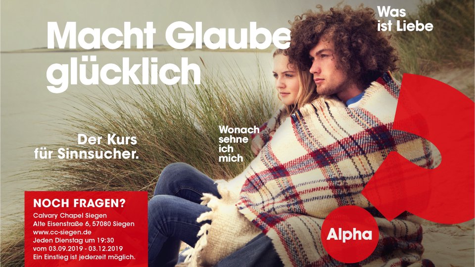 Der Kurs findet einmal die Woche in der CCS statt, Themen sind u.a. Macht glaube glücklich? / Was ist Liebe? / Wonach sehne ich mich? Anmelden könnt Ihr Euch unter: https://www.cc-siegen.de/alpha-kurs/