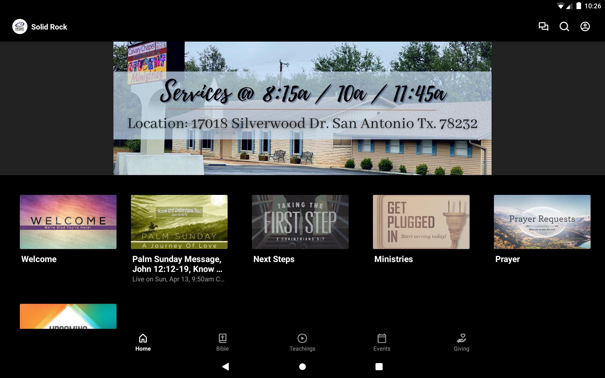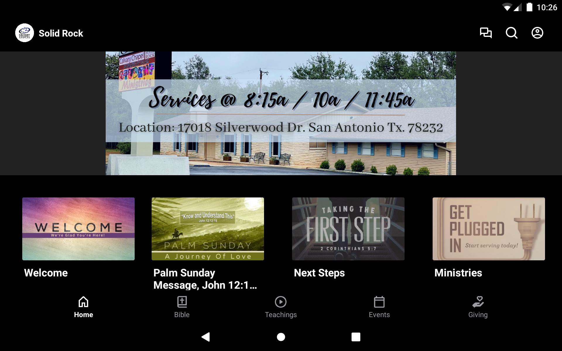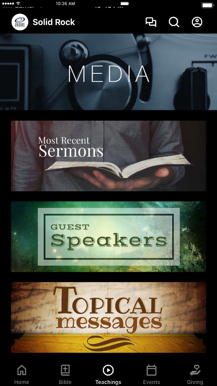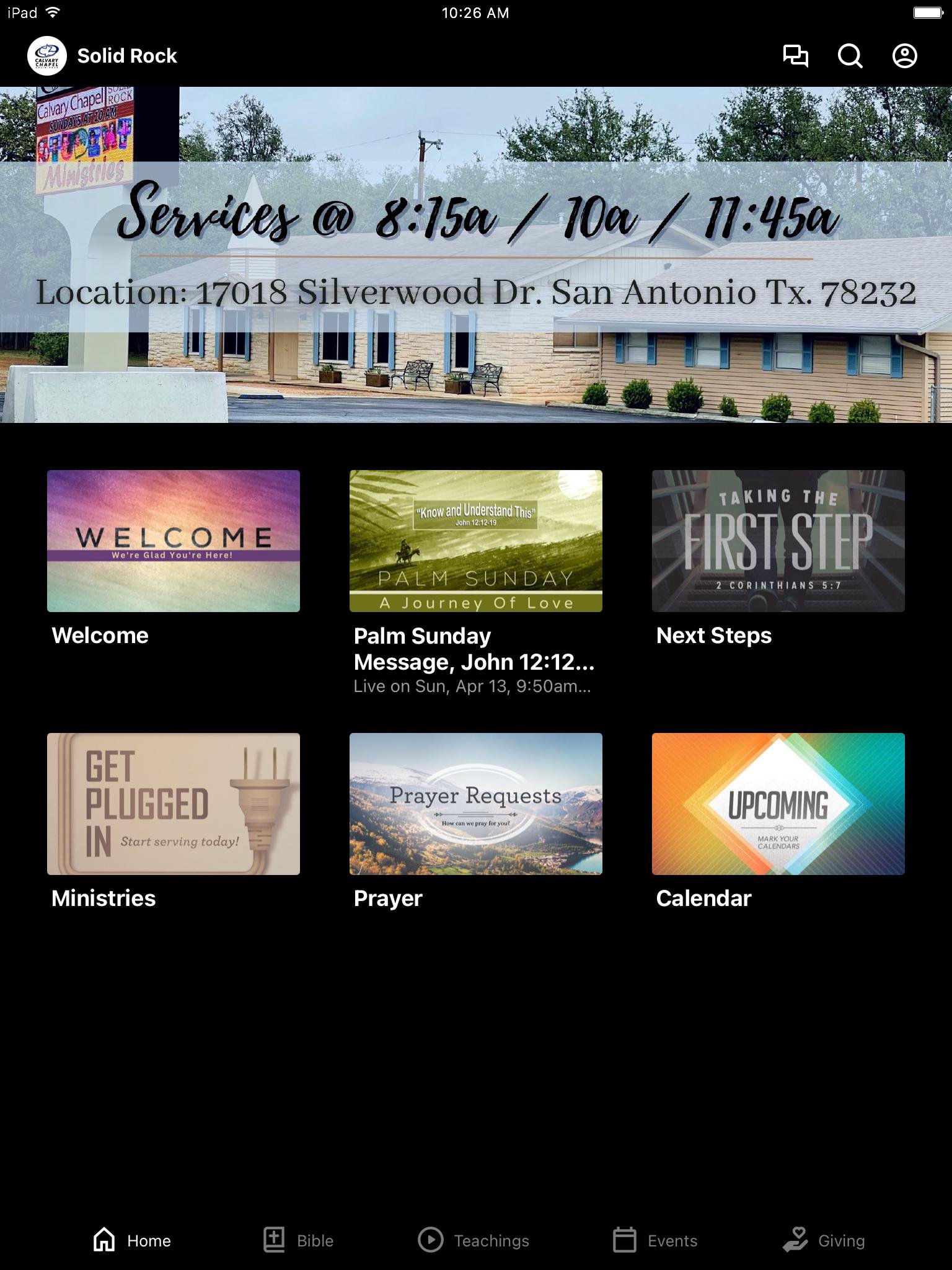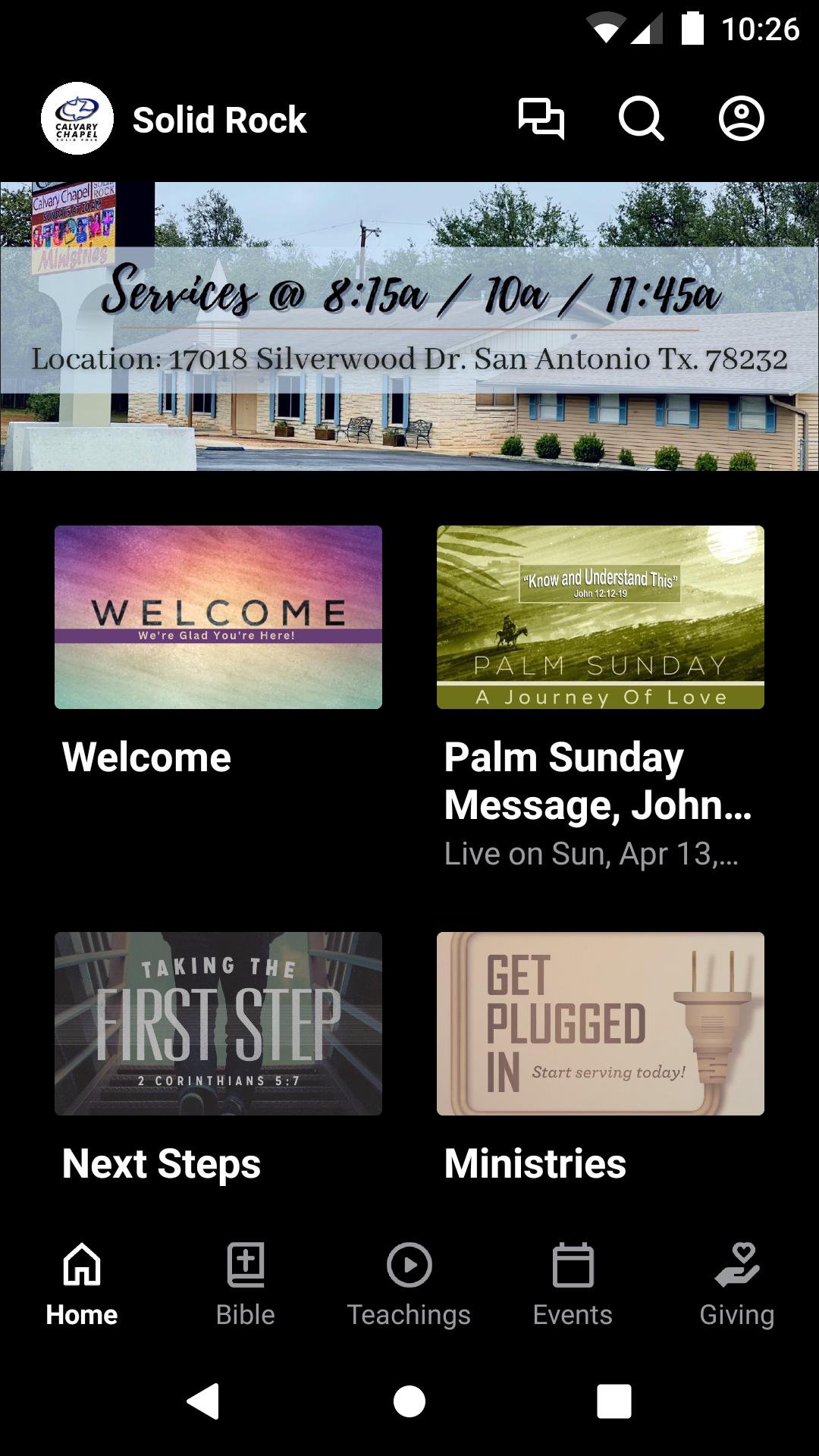 Welcome to the official Calvary Chapel Solid Rock App! Features: * Weekly sermon uploads - watch or listen to sermons on the go * Built in Bible for your convenience * Calendar list of upcoming studies, events and activities * Online giving * Church service times and up to date information * Check out all kinds of interesting content and share it with friends via Facebook, Instagram, or email and more... The Calvary Chapel Solid Rock App was created with the Subsplash App Platform.