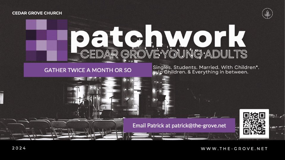 Patchwork is a gathering of young adults, young marrieds with or without children, single and working, single and going to school, or taking a gap year and everything in between. Coming together at Cedar Grove for worship, teaching, and community. We believe a Patchwork of young adults in various stages of life can bring beauty to the body of Christ here at Cedar Grove. Join us as we laugh, cry, and grow together!