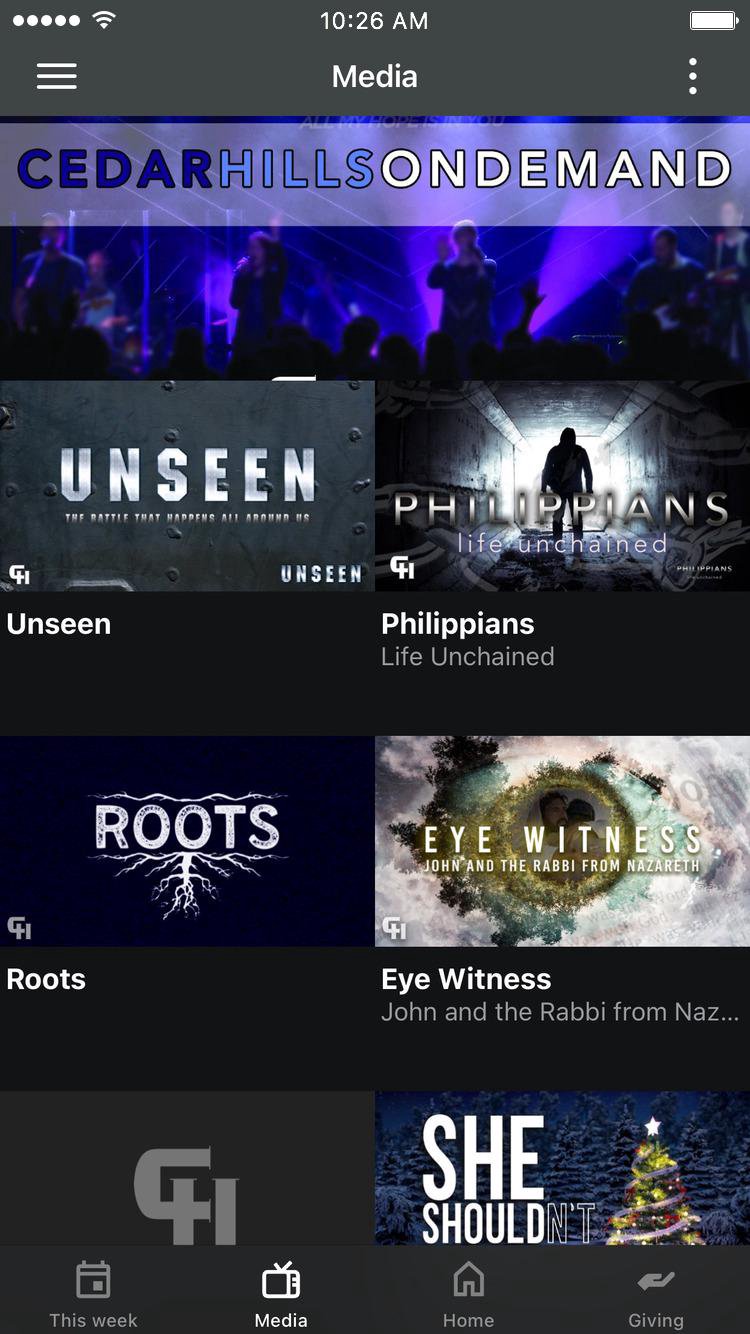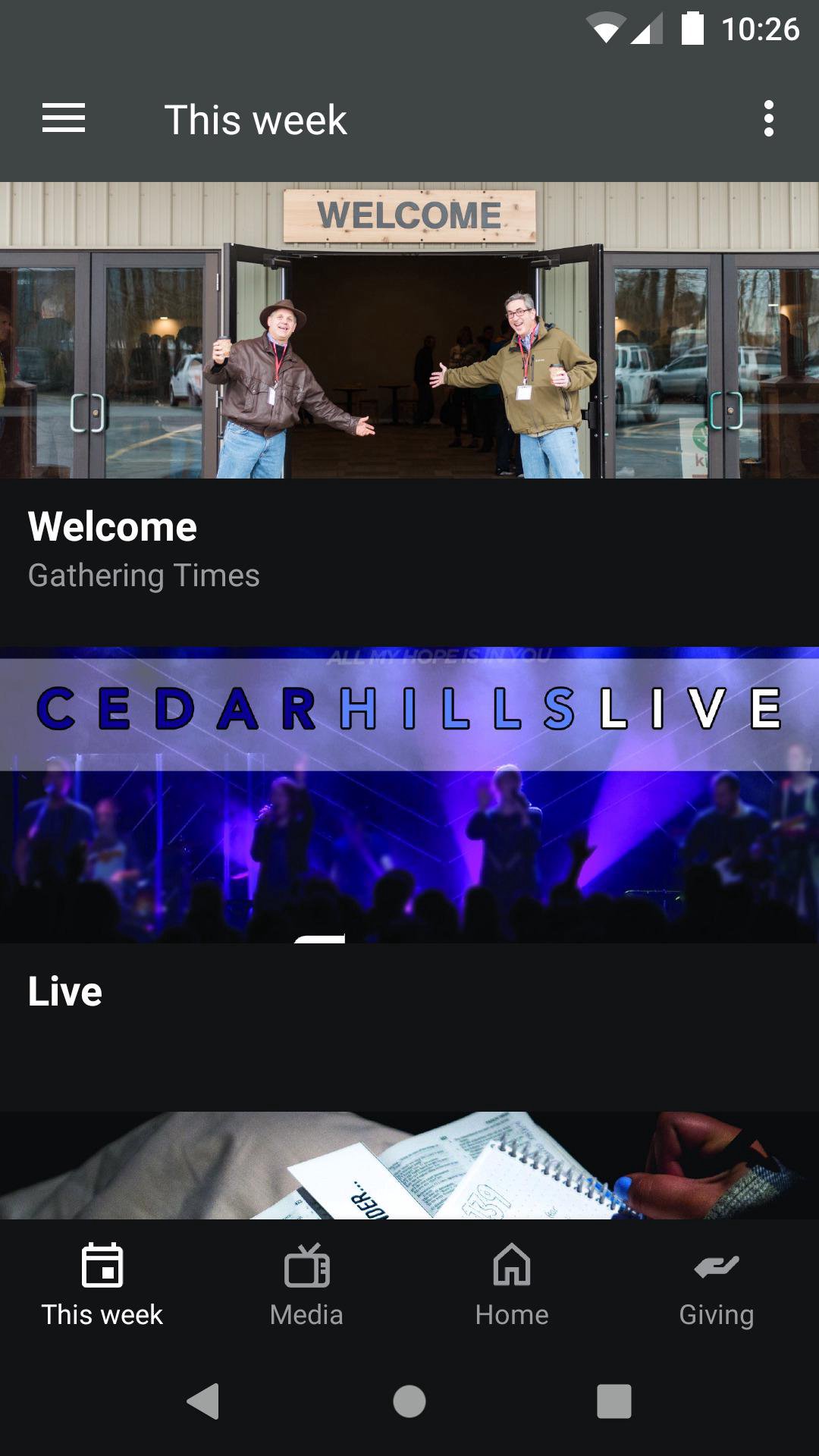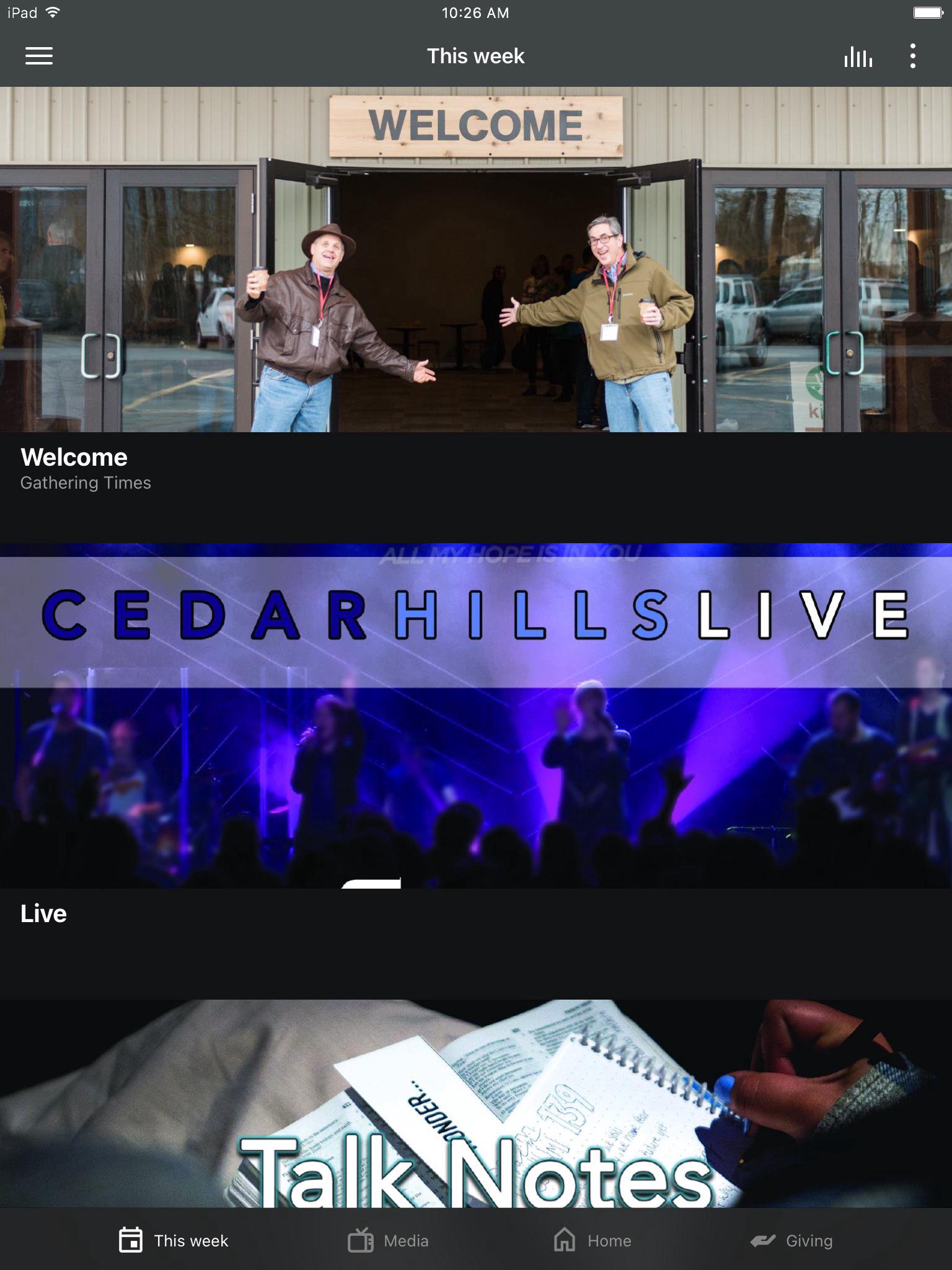This app will help you stay connected with the day-to-day life of Cedar Hills Church. With this app you can: watch or listen to past messages; stay up to date with Events; share your favorite messages; give tithes and fill out talk notes.