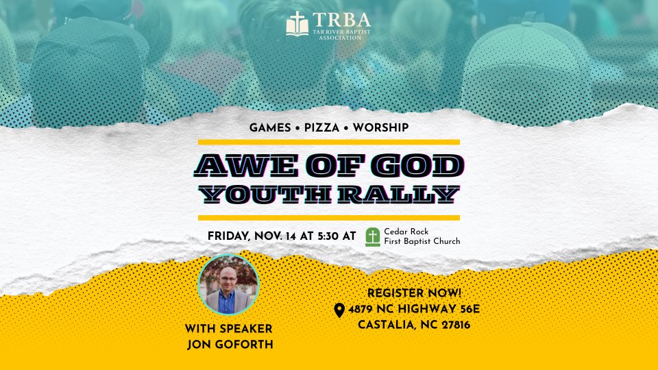 The Awe of God Youth Rally is a time for teens from Tar River Baptist Association churches to stand in awe of the greatness of our God. Enjoy engaging speaker, energetic worship, fun games, and free pizza.
