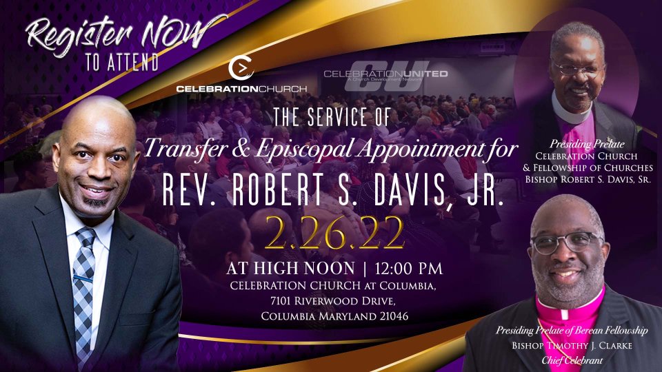 The Service of Transfer & Episcopal Appointment for Reverend Robert S. Davis Jr. On behalf of The Chief Celebrant, Bishop Timothy J. Clarke, The Sacred College of Bishops, and the Counseling Elders at Celebration Church, we are tremendously thrilled and extremely excited to announce that The Reverend Robert Stanley Davis, Jr., will be elevated to the office of Bishop in a service of Transfer & Episcopal Appointment, on February 26, 2022 at High Noon (12pm), and everyone is cordially invited to be with us on this most historic occasion. The service will take place at 7101 Riverwood Drive, Columbia, Maryland 21046. RSVP by February 16, 2022 using the link below. Adhering to our COVID safety policies, there will be a mask mandate on the premises, sanitization stations, and CDC compliant pre-registration.