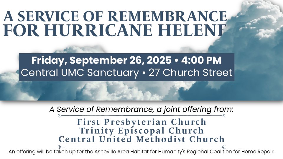 Now, one year later, we invite you to gather once again for A Service of Remembrance, a joint offering from First Presbyterian Church, Trinity Episcopal Church, and Central United Methodist Church. Through prayer, Scripture, and song, we will grieve what was lost, remember what we endured, and find hope in what still unites us. An offering will be taken up for the Asheville Area Habitat for Humanity's Regional Coalition for Home Repair.