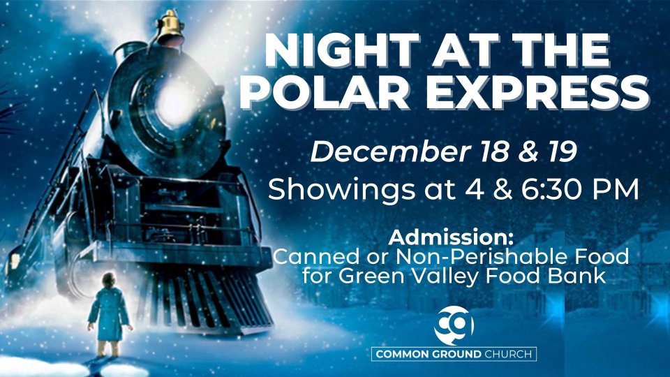 All aboard! Get ready for a fun opportunity for the whole family this Christmas. Experience the movie together as well as fun activities for the kids. Register to reserve your seat(s). Free admission with a canned food donation to the Community Food Bank of Southern AZ. One free kids' combo for every kid too. Sponsored by Common Ground Church of Sahuarita in partnership with the Desert Sky Cinema. COMMUNITY SHOWINGS: FRIDAY (12/18) & SATURDAY (12/19) for everyone in the community. Movie plus kids' activities. Times: 4 PM and 6:30 PM each day. CHURCH SHOWING: SUNDAY (12/20) for CG Church volunteers and families. Movie plus kids' activities. Time: 4 PM. LIMITED CAPACITY FOR EACH SHOWING (50 seats per theater). PLEASE ONLY REGISTER FOR ONE SHOWING AND ONLY FOR THE NUMBER OF SEATS YOU WILL DEFINITELY NEED. THANKS. REMINDER: If you're feeling ill, have a fever, or have been exposed to someone with Covid-19 please do not plan on participating. Face masks are required and proper social distancing is expected.