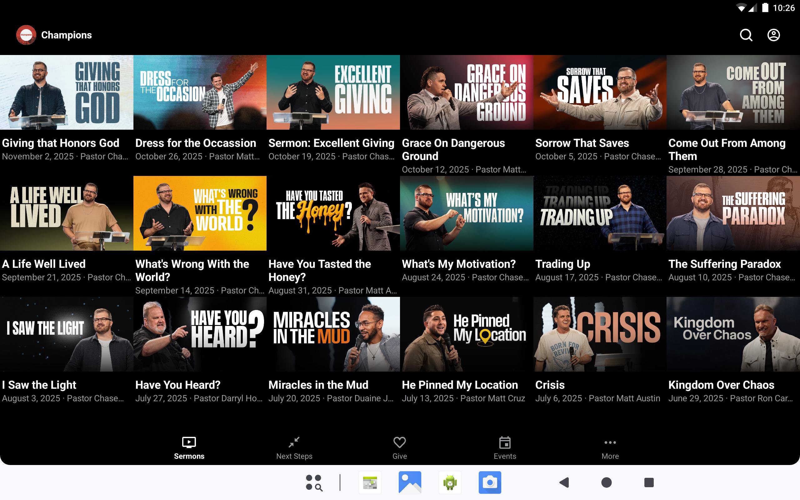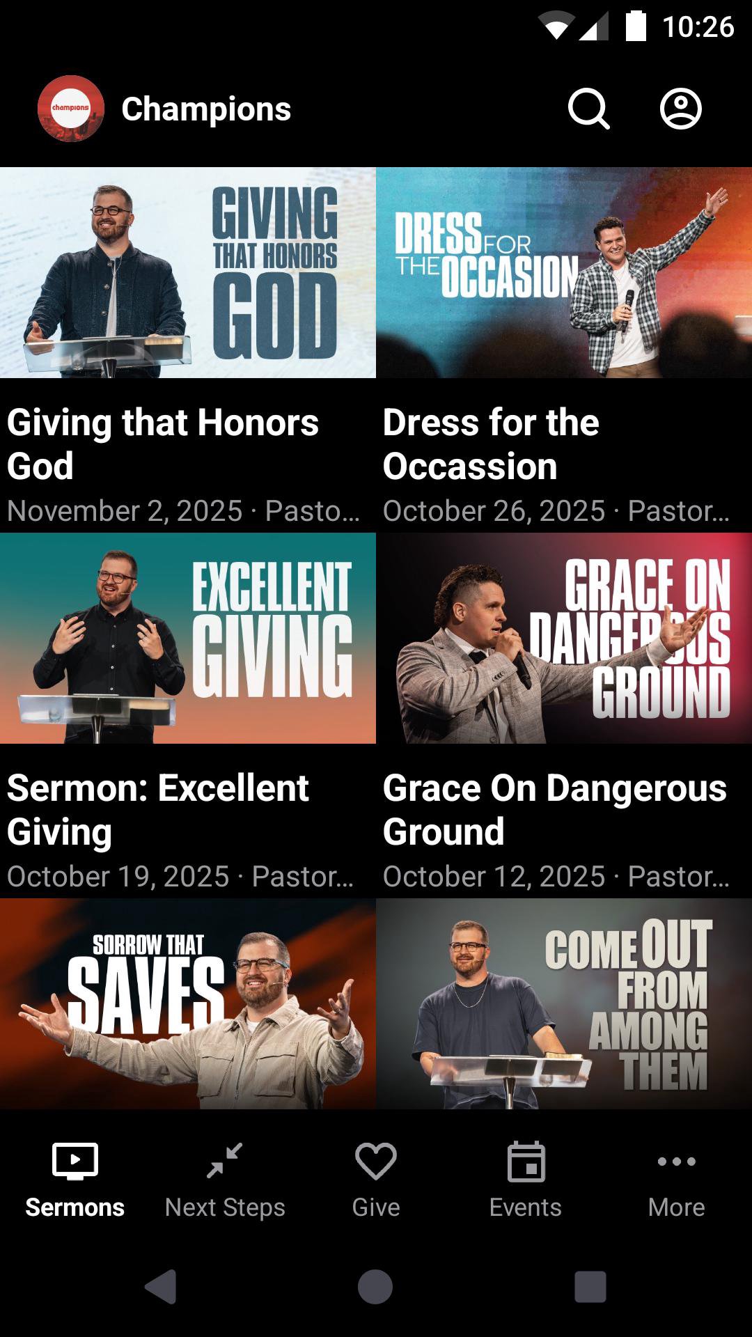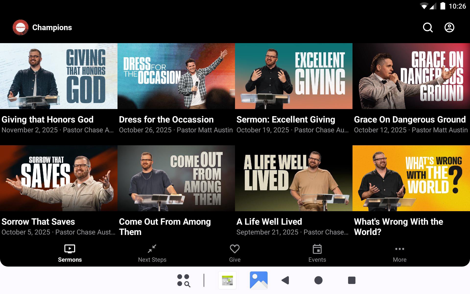Welcome to the official Champions Church app! :) We exist to help people know God, find freedom, discover purpose, and make a difference. It's our firm belief that serving our community is serving our purpose, and we want to help share the message and love of Jesus with as many people as we can. What better way then having it in your pocket 24/7? If you're out of town on Sunday, you can watch the message OnDemand or give through the app. There's also an OnDemand list of the messages, so next time you're on that long drive, plug in the aux cord, and let's do church, y'all! Tell a friend about the app, or share something on social. Remember! Use #championscc and tag us @championscc For more info about Champions Church, please visit: http://www.championscc.org/ The Champions App was created with the Subsplash App Platform.