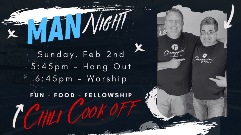 This is a perfect night to hang out with some great guys at Changepoint. We'll have a Chili Cookoff followed by a time of worship together. Come on out!