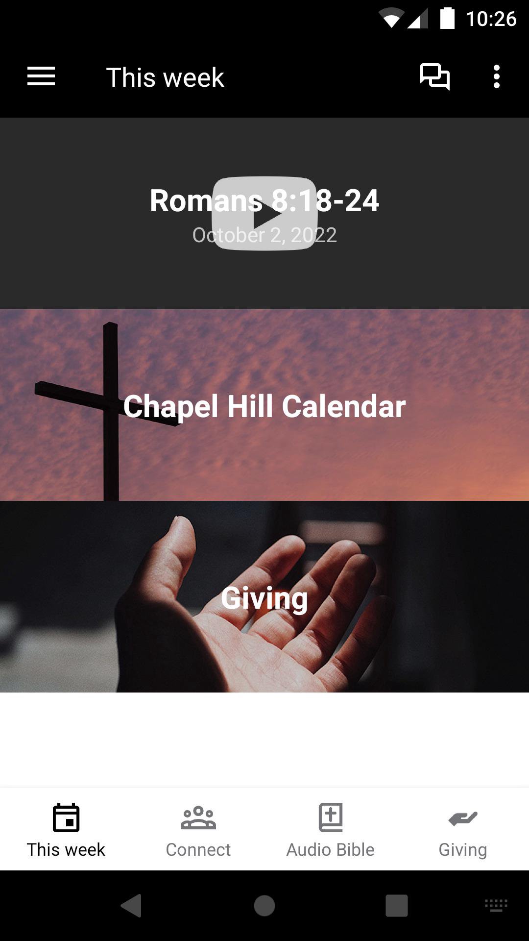 This app will help you stay connected with the day-to-day life of Chapel Hill Church of the Nazarene. With this app you can: watch or listen to past messages; stay up to date with push notifications; share your favorite messages via Twitter, Facebook, or email; and download messages for offline listening.