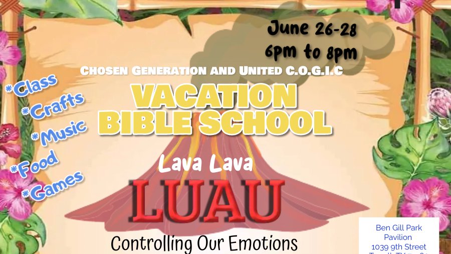 Keeping cool when things get hot! Our Emotions can feel like a force of nature, but with God’s instructions and help, we can take control of our emotions before the volcano of emotions explode! During the Lava Lava Luau 3-Day VBS, we will learn Biblical ways on how to express and deal with our emotions.