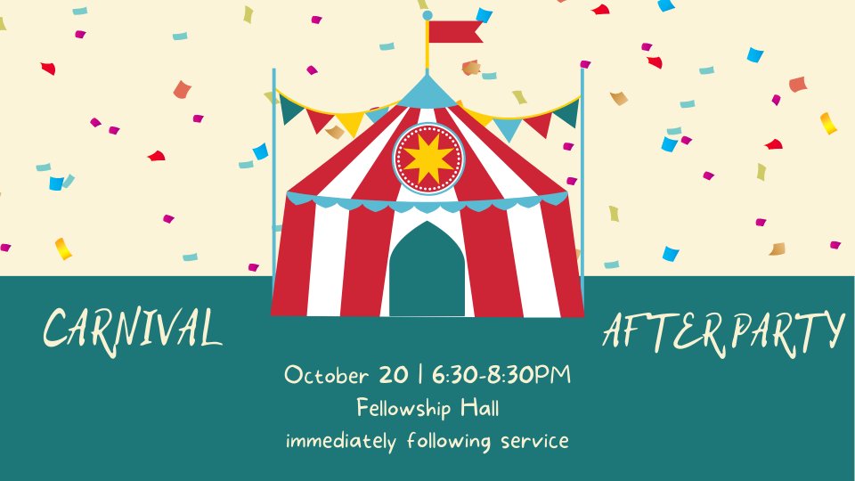Join us for our Youth After Party immediately after the service! Our carnival themed party will take place in the Fellowship Hall. We hope to see you there!