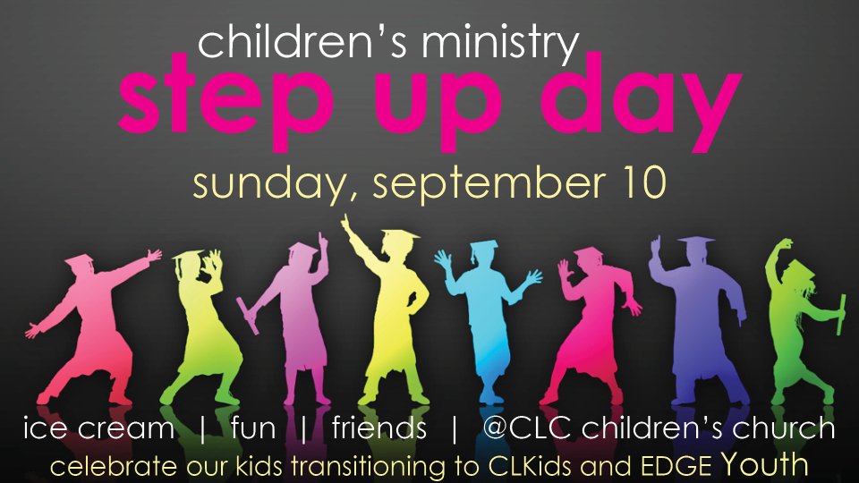 We are looking forward to getting to celebrate with the kids who are moving up to the next classroom at our Step Up Day on Sunday, September 10 during children's church (during 1st & 2nd service) here at CLC! We will have games & ice cream to congratulate the children who are moving up to the Faith Factory or up to the EDGE Youth Class. Please help us get a head count ahead of time by hitting the "RSVP here" button on this page! For more information, contact Martin Pelletier by hitting link for his email on this page. You can also hit the link for the phone number and wait to dial his extension, xt. 221, when prompted.