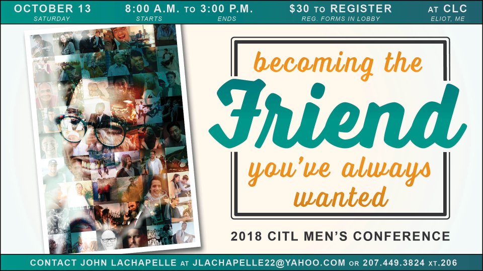 Men! Make sure you join us for our 2018 CITL Men's Conference! Our theme this year is "Becoming the Friend You've Always Wanted." Friendship is something that often evades us as men because of fear. We fear being judged, criticized, or rejected, mainly because we judge, criticize, and reject ourselves. It's time to cut that out! It's time to become the friend you've always wanted! If you're ready to change and help other guys do the same, then join us on Saturday, October 13 from 8:00 a.m. to 3:00 p.m. right here at CLC. The cost is $30 to attend, which pays for lunch and conference materials. Register today by hitting the link below! Or contact John Lachapelle (xt.206) with any questions. Click the link for his email on this page, or hit the phone number on this page, and wait to dial his extension, 206.