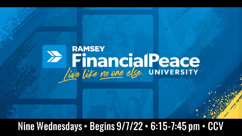 Wednesdays @ 6:15 pm, starting on September 7th. "Financial Peace University is a nine-lesson course that teaches you how to save for emergencies, pay off debt fast, spend wisely, and invest for your future. And no complicated financial blah blah blah over here. For over 25 years, Dave Ramsey’s been teaching commonsense, biblical money principles that work. Every time."